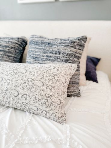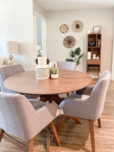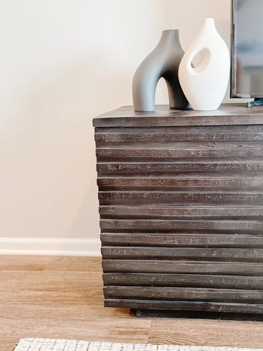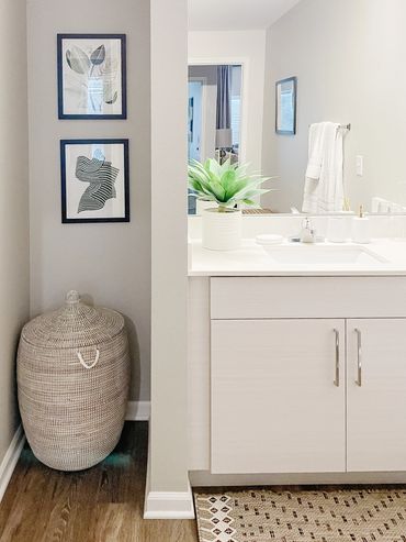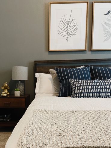 With dark-to-light contrasts and tasteful pops of color, this multi-family interior design model apartment is staged for perfection at Kinsley Forest creating a design to both spark interest and impress. The living room incorporates lighter neutral tones and darker black and wood touches with a smaller-scale sofa featuring a chaise to show off the openness of the space. The sofa is accentuated with a collection of decorative pillows in varied tones and paired with an accent chair in sable gray with dark wood and black accents. Mango wood tops adorn both the coffee and side tables with iron bases. An ample-sized desk and unique desk chair make the most of the open concept in the back corner and create the perfect work-from-home spot. The bathroom has a serene vibe with a neutral palette popped with a few plants, while the bedroom features striped bedding and rich Acadia wood for the dresser, bed, and nightstands. Accents of navy and a neutral gray contribute to the bedroom’s subtle pop.