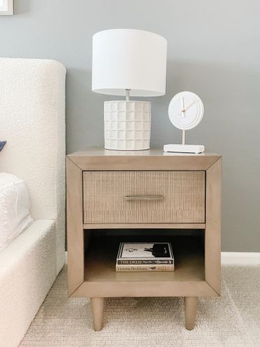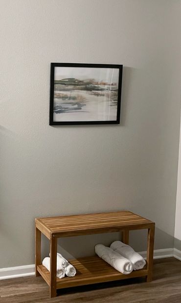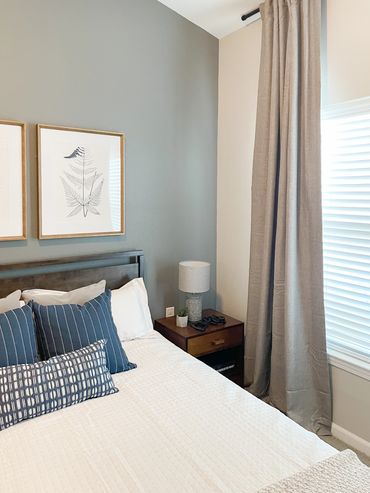 The large bathroom boasts a gallery wall of art, a luxurious teak bench, and neutral-toned trays, canisters, and soap dishes. The rrimary bedroom features a large queen bed frame enwrapped in gorgeous textured bou·clé fabric, cool-tone wood nightstands, a room-magnifying full-length mirror, and tall drapery that flaunt the fabulous high ceilings. The secondary bedroom has a deep masculine feel with dark wood tones and floor-to-ceiling neutral-toned drapery, complemented by artwork to create the illusion of a larger space.