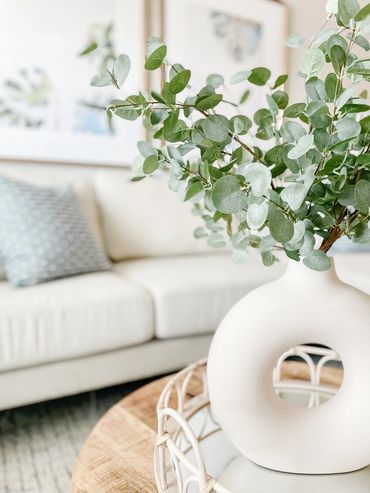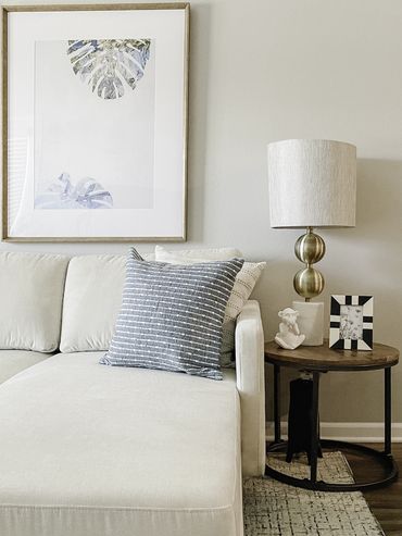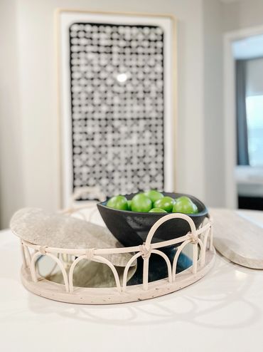 Upon entering the kitchen, you'll immediately notice the ample counter seating, featuring a stylish mix of dark wood tones with modern gold accents. The space between the primary bedroom and bathroom creates an eye-catching nook, complete with a funky mid-century modern bookcase and a stunning faux tree adorned with woven art decor, bringing the entire space together. The living area showcases an elongated neutral sofa with a chaise, accompanied by a cool gray accent chair with textured fabric. Complemented by blue and neutral striped decorative pillows, a chic light wood and black coffee table, and wood and metal nesting side tables, this space is sure to impress. Step outside to the ample patio, which features a chic French bistro table set with a classic curvaceous structure.